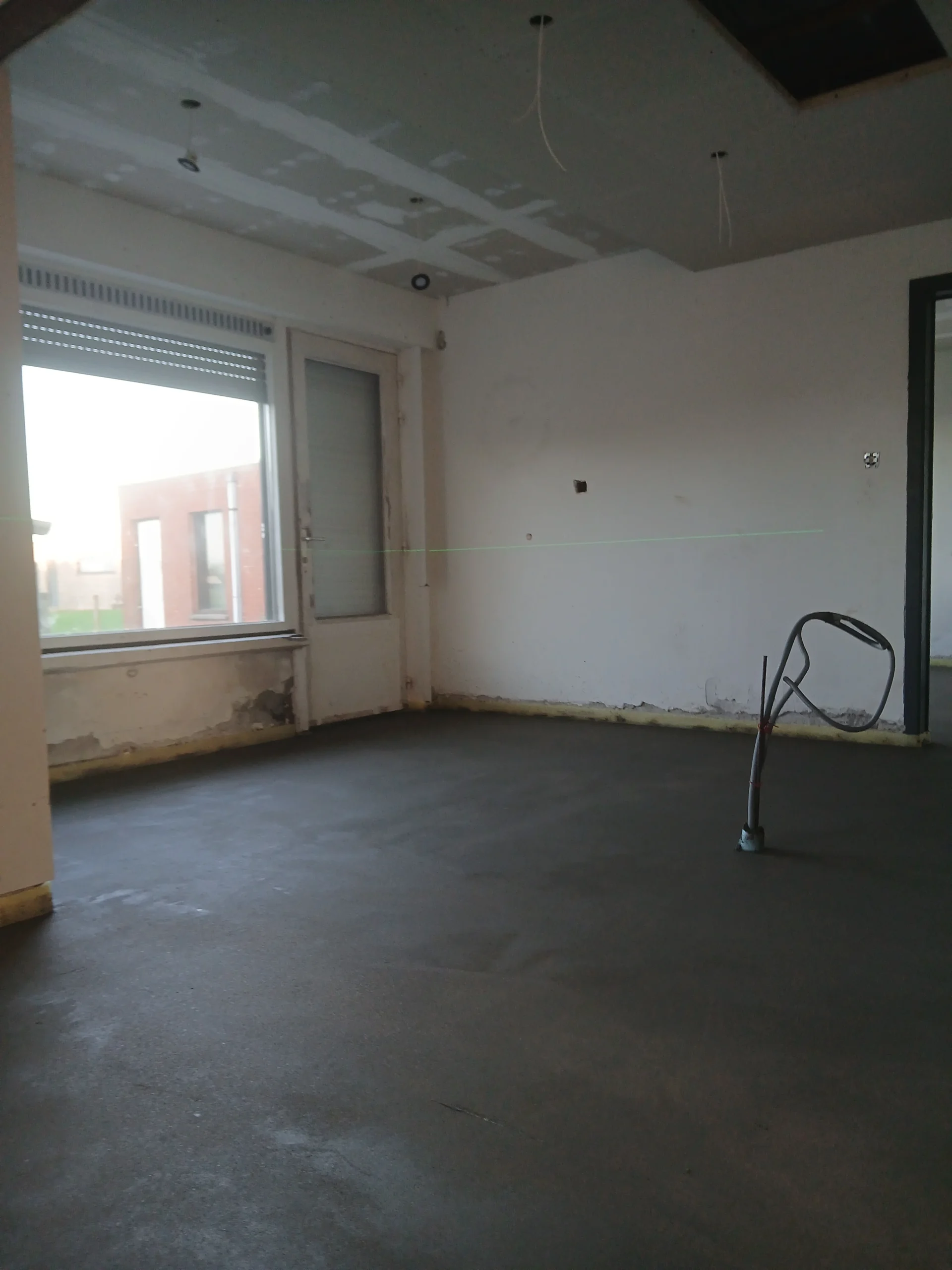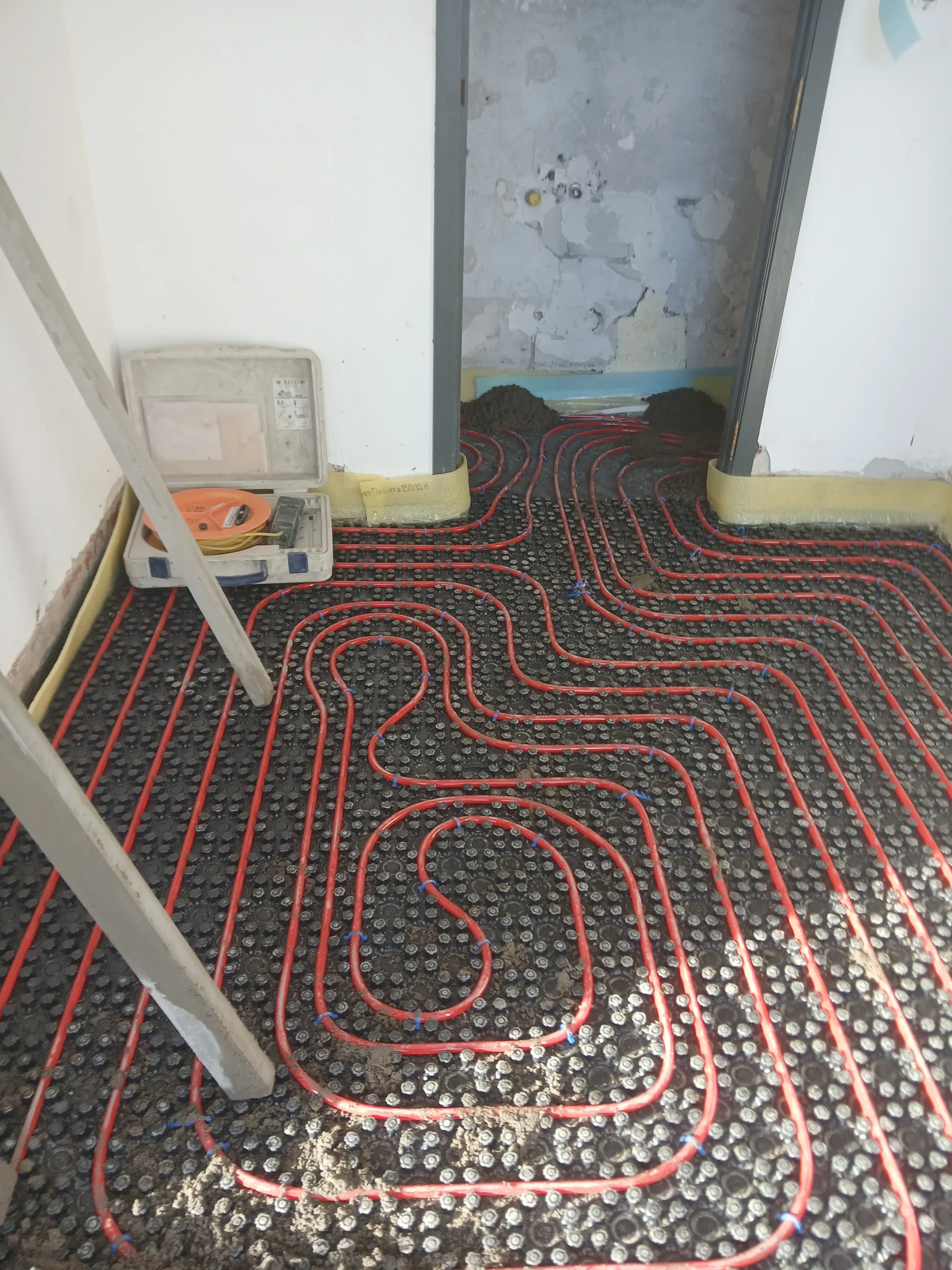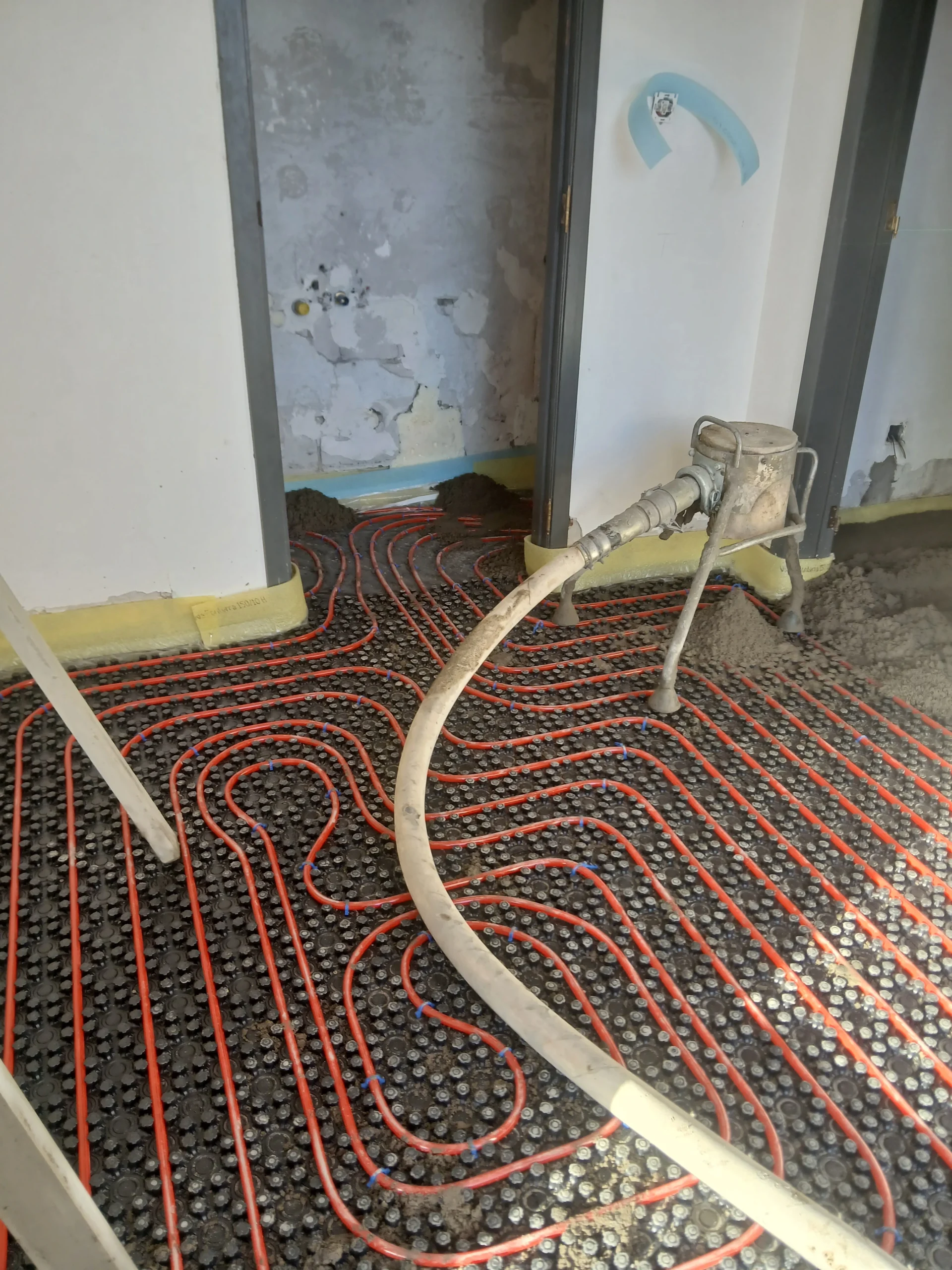 Deze renovatie vereiste een zeer sterke en vlakke basis voor het verlijmen van groot formaat tegels. Wij plaatsten chape versterkt met vezelcompound. Op de noppenplaten waarin de vloerverwarming werd geplaatst hebben we een gewapende chape voorzien. De vezelversterking voorkomt scheuren die kunnen ontstaan bij temperatuurschommelingen. Na een drietal weken is deze droog om de tegels te verlijmen op de chape.