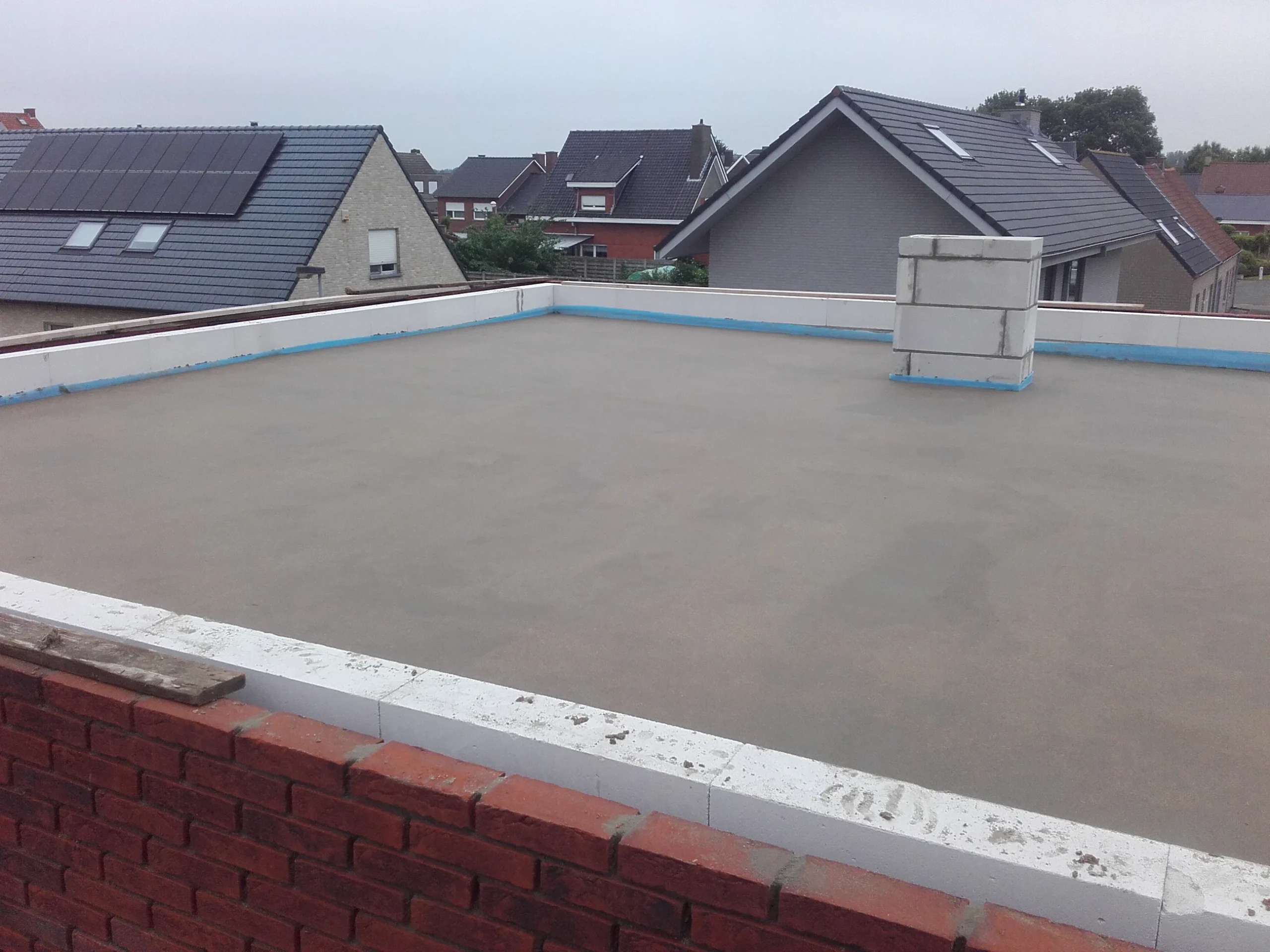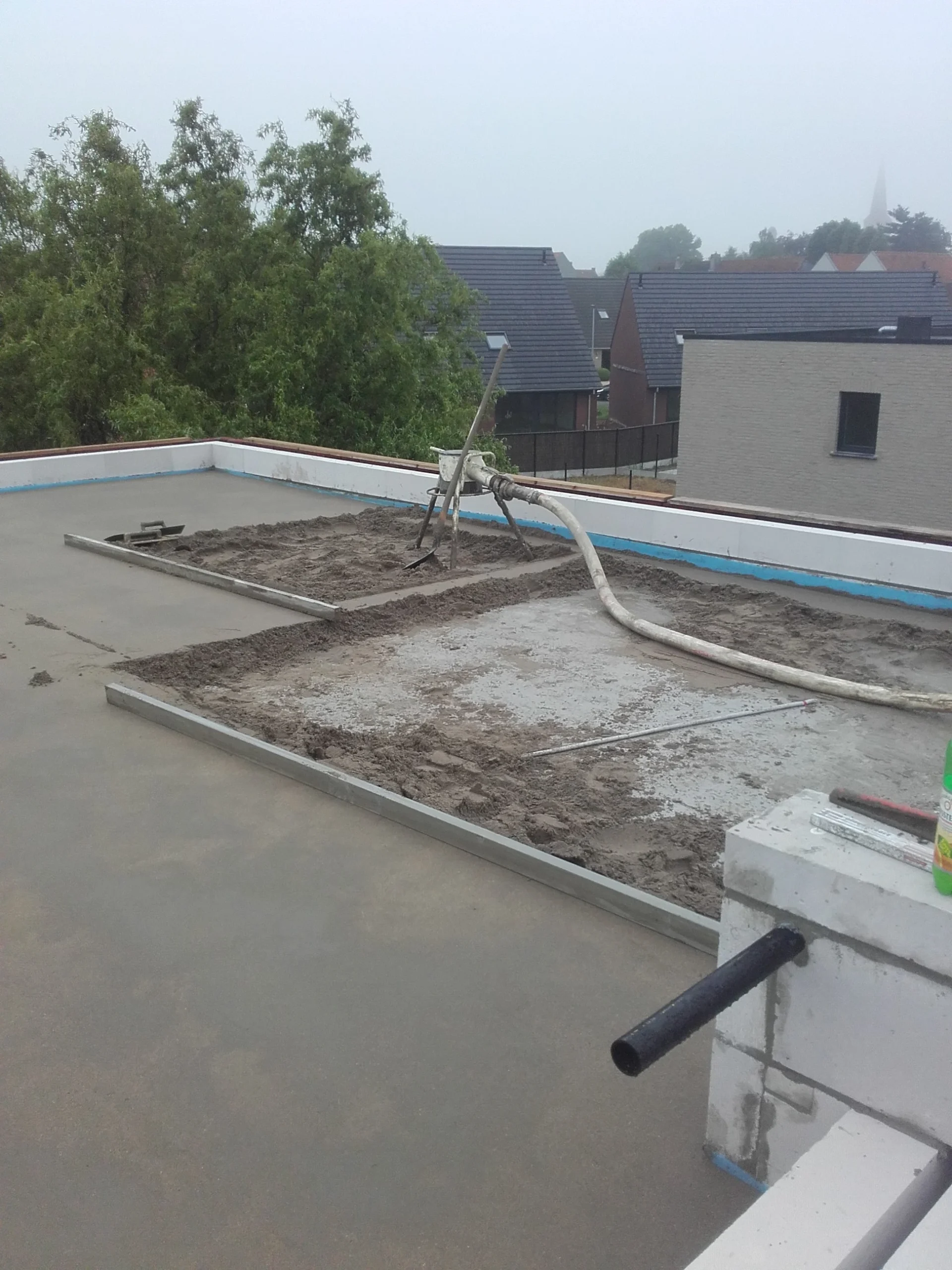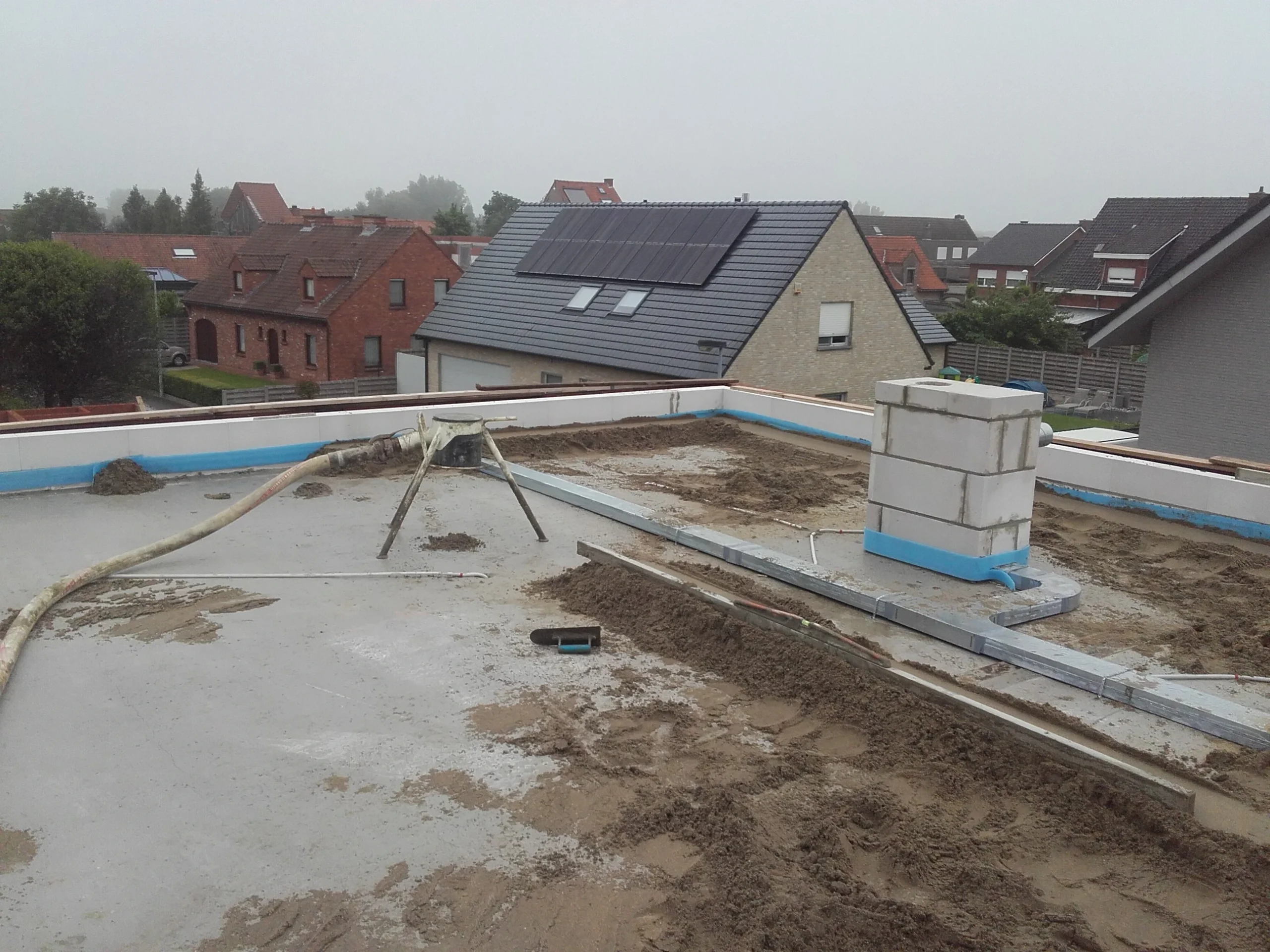 Op het dak van de woning werd een hellingschape aangebracht om een correcte en efficiënte waterafvoer te garanderen. Door de nauwkeurig uitgevoerde hellingsgraad kan regenwater vlot richting de afvoeren stromen, waardoor stilstaand water en mogelijke lekkages vermeden worden.