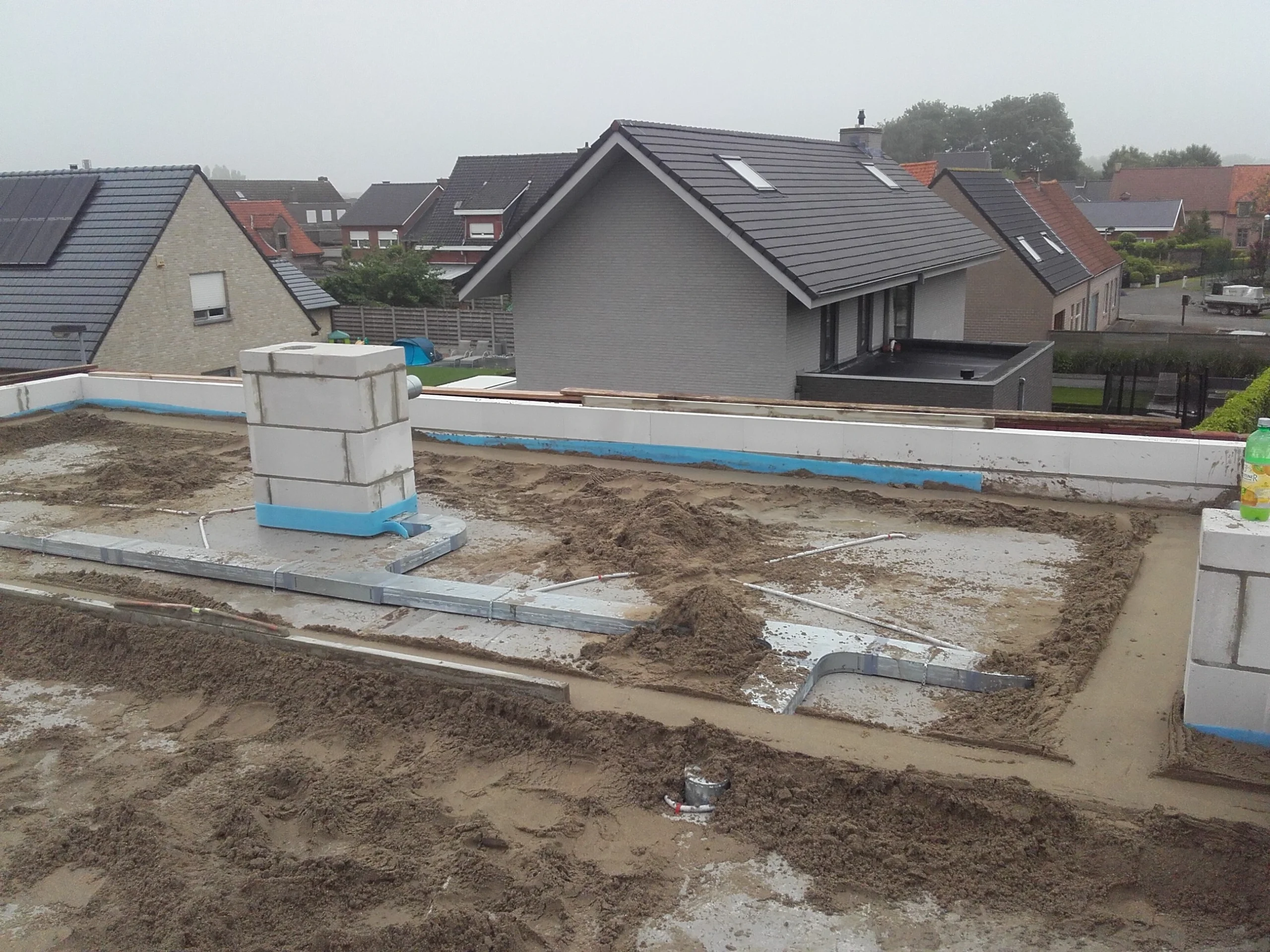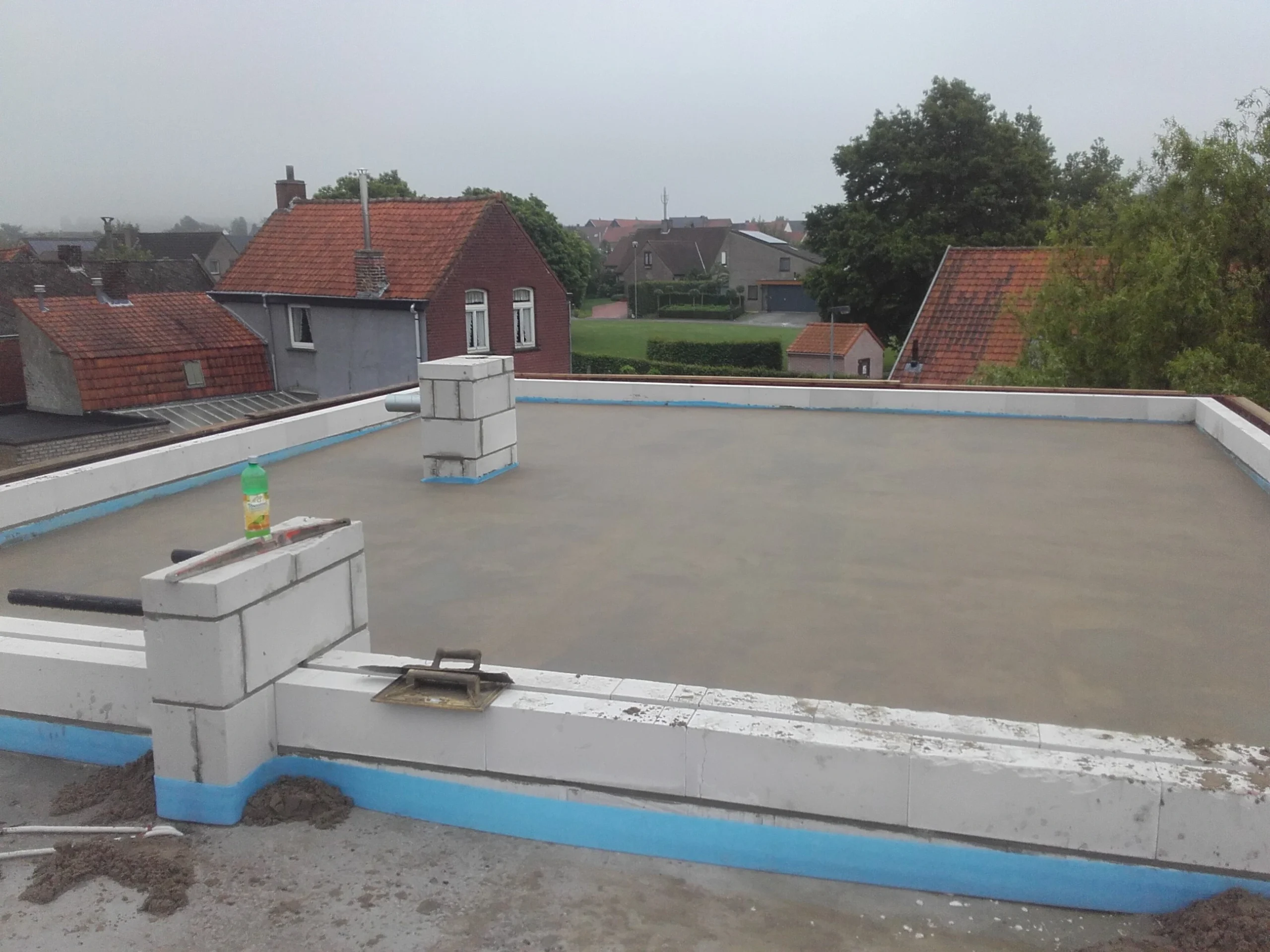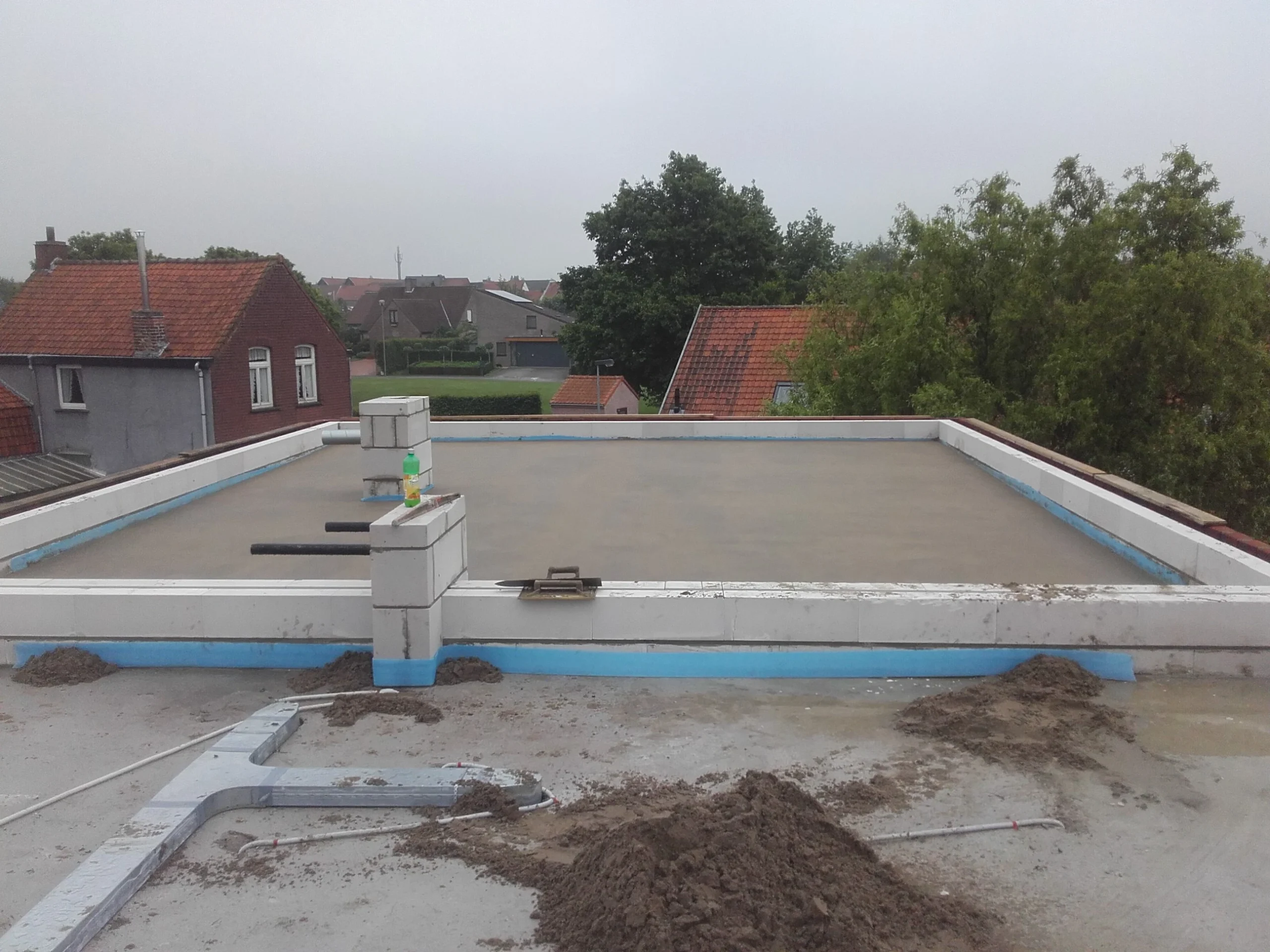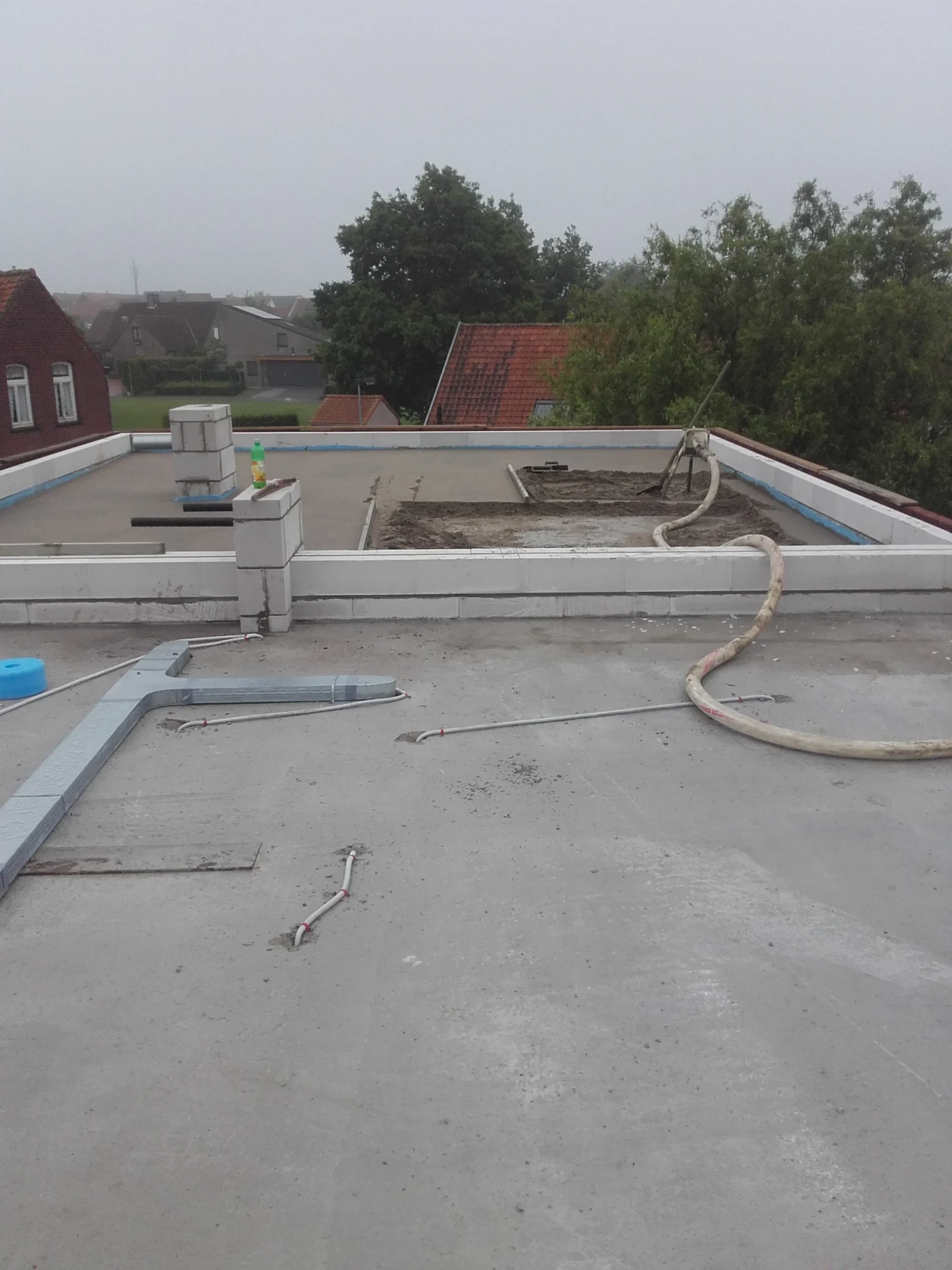 Op het dak van de woning werd een hellingschape aangebracht om een correcte en efficiënte waterafvoer te garanderen. Door de nauwkeurig uitgevoerde hellingsgraad kan regenwater vlot richting de afvoeren stromen, waardoor stilstaand water en mogelijke lekkages vermeden worden.